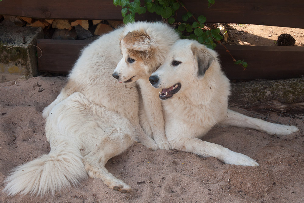 Der Altersabstand von drei Jahren erscheint uns als optimal, da die „Fronten“ nach drei Jahren geklärt sind und ein erwachsener Pyrenäenberghund die Erziehung des Welpen mit übernehmen kann. Da wir als Papa für den D-Wurf Balou du Petit Voyou nehmen konnten, hatten wir das große Glück in einer D-Hündin all unsere bisherigen Hunde vereinigen zu können.