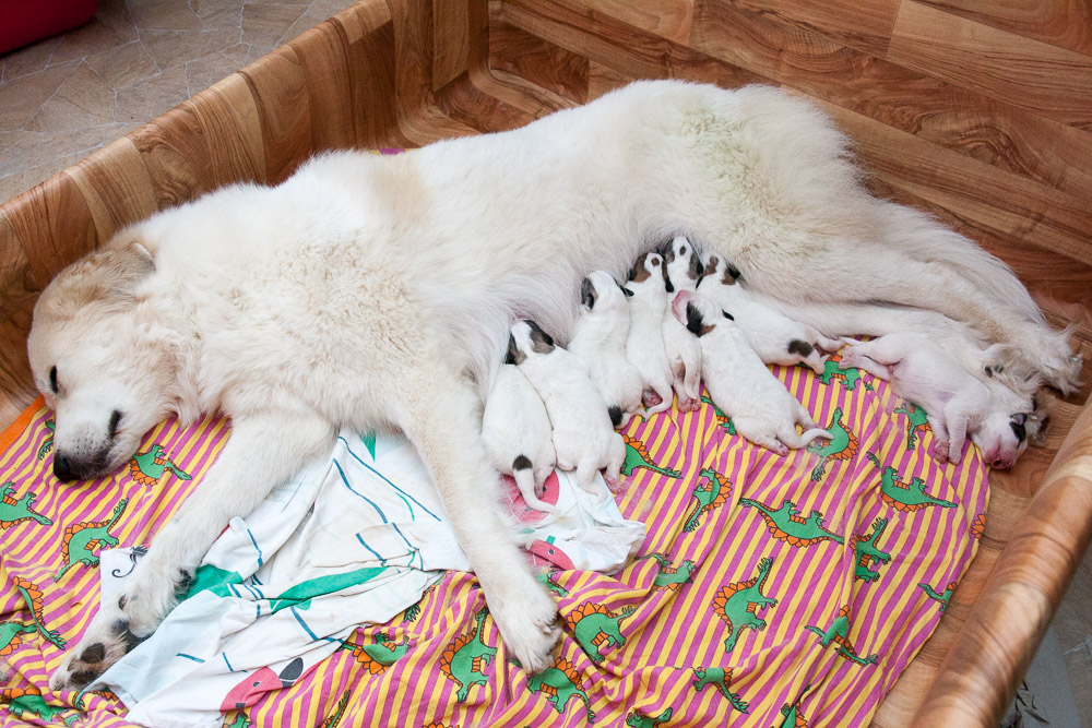 Als am 08.11.2015 die D‘s auf die Welt kamen gab es 5 Rüden und 3 Hündinnen, was unsere Auswahl nicht gar so schwer machen sollte. Im Endeffekt war es jedoch Héloise, die uns sehr deutlich zeigte, dass sie unter allen Pyrenäenberghund Welpen, die sie alle mit sehr großer Hingabe versorgte, eine Favoritin hatte.